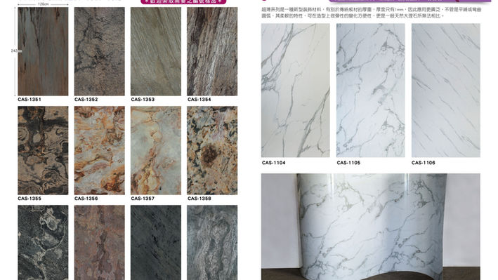 對紋采鏡板~使用印刷方式打造的仿大理石板,重量輕巧,表面光滑,仿真度高,選擇眾多,色澤可控,有對紋與對花系列,不僅適合簡單素雅的家居裝潢(電視牆、沙發牆、床頭牆、浴室牆),高質感的商業空間 (例如餐廳、會議室、電梯間、氣派門口、吧台),厚度僅有3mm,加工切割都很容易,此種裝飾建材價格也比天然大理石親民,全系列採訂製款,台灣製作哦~