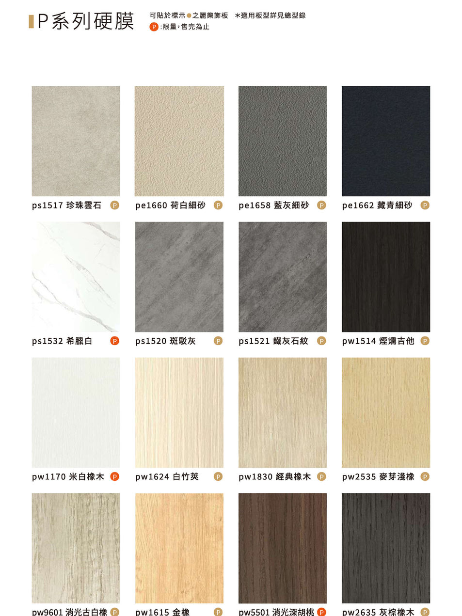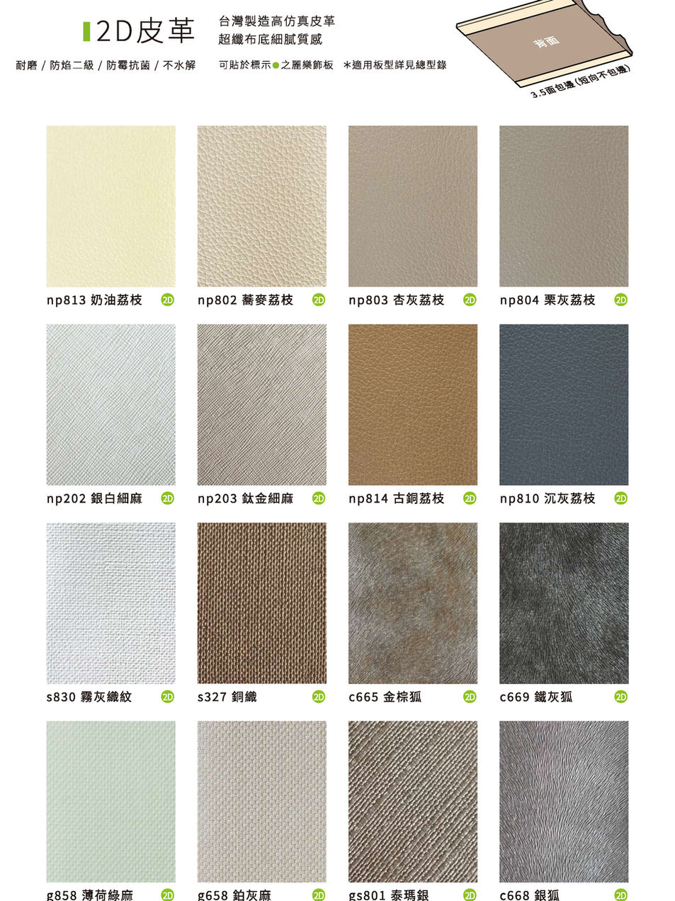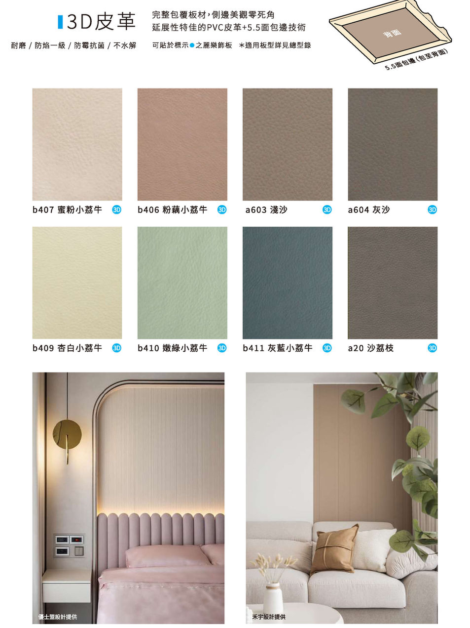 每年我們都會為皮雕板的皮紋選樣重新篩選,汰舊換新,持續有新意,根據材質不同,有3D皮革、2D皮革、P系列硬膜,豐富多樣的表面質感讓設計師總能找到喜愛的~