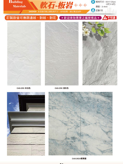 ★尺寸:板岩為60x120cm,其他皆為60x240cm。